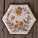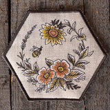 Protect your surfaces in style with the Rustic Elegance Bees & Blooms Hexagon Trivet. This in-the-hoop design stitches entirely in the hoop and showcases a floral and bee motif framed in a geometric shape. A lovely mix of farmhouse flair and delicate detail. Get the coordinating, trivet, border, corner and wreath in the design pack to create a whole kitchen set.
