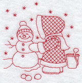 Sunbonnet Sue builds a snowman in this Redwork winter scene.