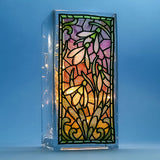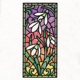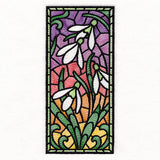 Inspired by stained glass, this machine embroidery design features snowdrop flowers in a rectangular frame.