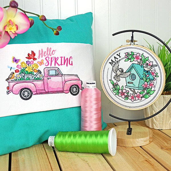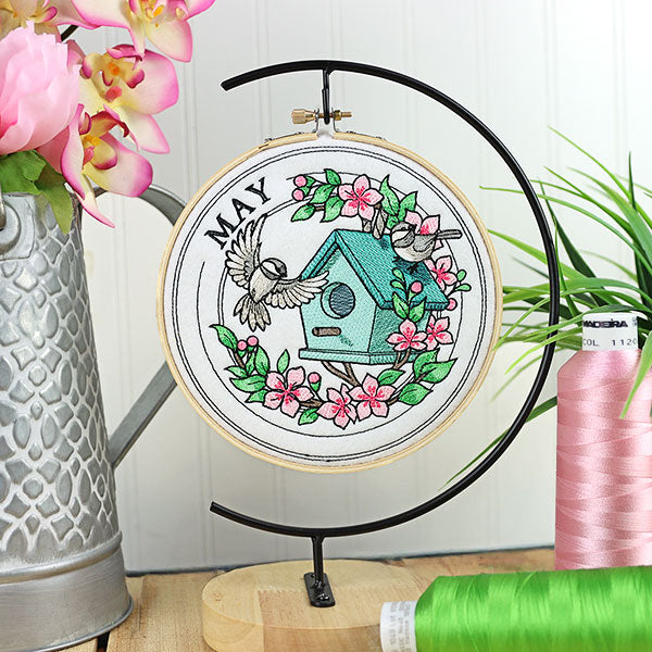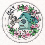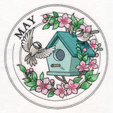 Welcome the month of May with this machine embroidery design. It's done in our beloved stamp style, and features a birdhouse & chickadees, wreathed in beautiful flowers. The word "May" sits along the outer ring.