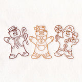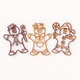 Three sweet gingerbread men are ready for Christmas in this machine embroidery design.