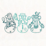 Three festive snowmen are bundled up for Christmas in this machine embroidery design.