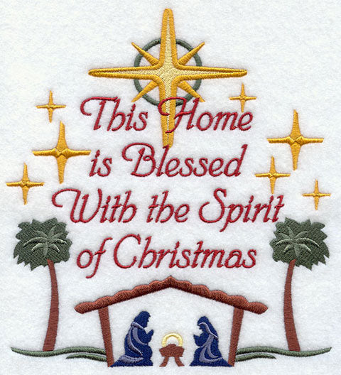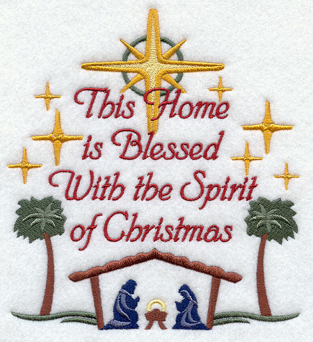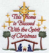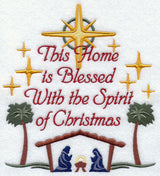 The words "This Home is Blessed with the Spirit of Christmas" in a beautiful design for pillows, wall hangings, tree skirts, and more.