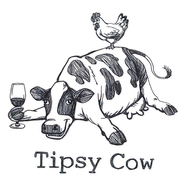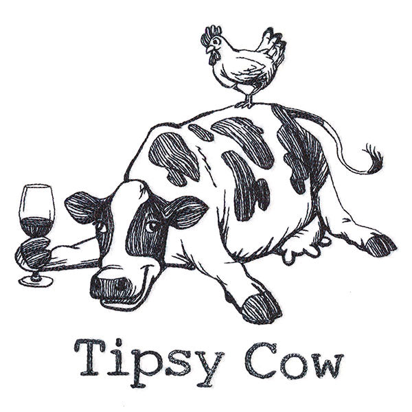 We've all been there! Stitch this fun-loving cow on pillows, totes, tea towels, and more. This machine embroidery design contains sheer stitching and open areas; embroider on light-colored fabrics for best results.