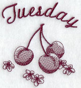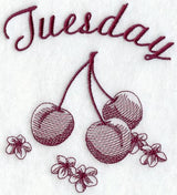 A bunch of cherries in toile, with the word 'Tuesday.' Great for days of the week dishtowels