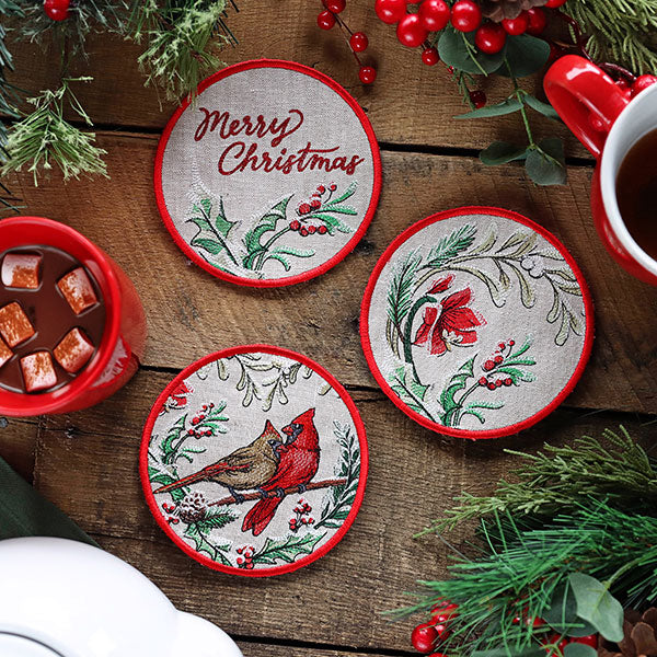Add a festive flourish to your holiday table with these in-the-hoop coasters! Featuring beautiful Christmas botanicals and a cardinal, these designs bring timeless cheer to any seasonal setting. Stitch it up as a quick gift, party favor, or decorative accent for your Christmas gatherings.