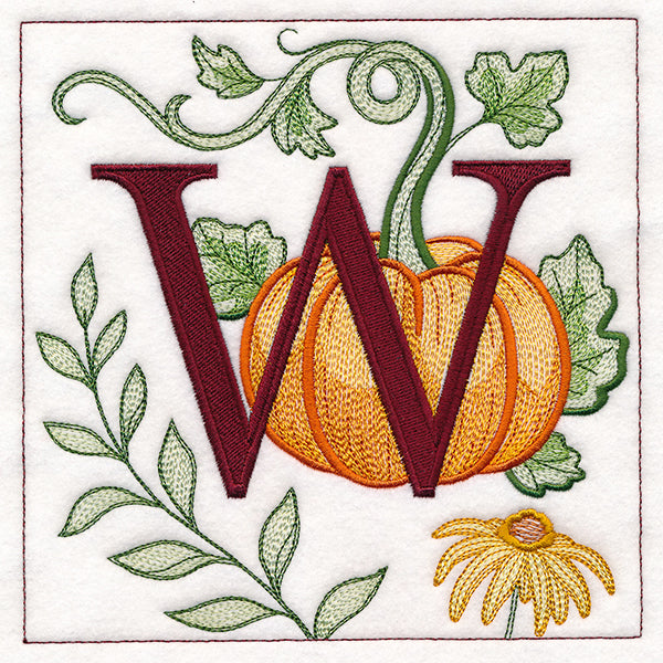 The letter "W" is surrounded by a pumpkin and autumn botanicals in this stunning square.