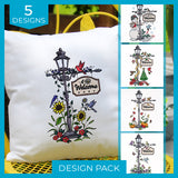 Each design includes a welcoming sign and cheerful details like birds, butterflies, holly, and more—making this pack perfect for pillows, wall hangings, and entryway accents. Whether you're decorating for a holiday or simply celebrating the beauty of the seasons, these elegant lampposts shine in every stitch.