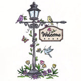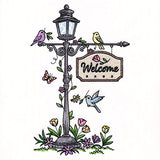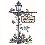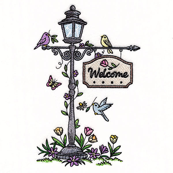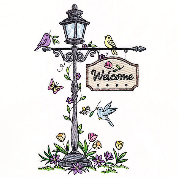 Make garden flags, pillows, and more with a spring lamppost motif featuring birds, flowers, and a beautiful welcome sign.