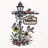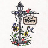 Make garden flags, pillows, and more with a summer lamppost motif featuring birds, flowers, and a beautiful welcome sign.
