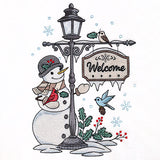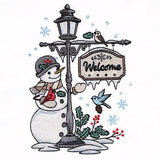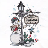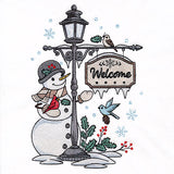 Make garden flags, pillows, and more with a winter lamppost motif featuring birds, a snowman, snow, and a beautiful welcome sign.