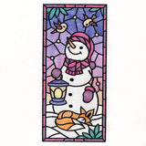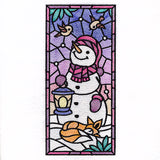 Welcome winter with a cheerful heart when you stitch this stained-glass-inspired scene featuring a snowman with woodland animals. They're holding a lantern.
