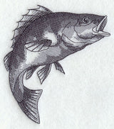 A quick-stitching fish sketch features a yellow perch, leaping high into the air. Striking on lightweight towels, shirts, gear bags, and more.